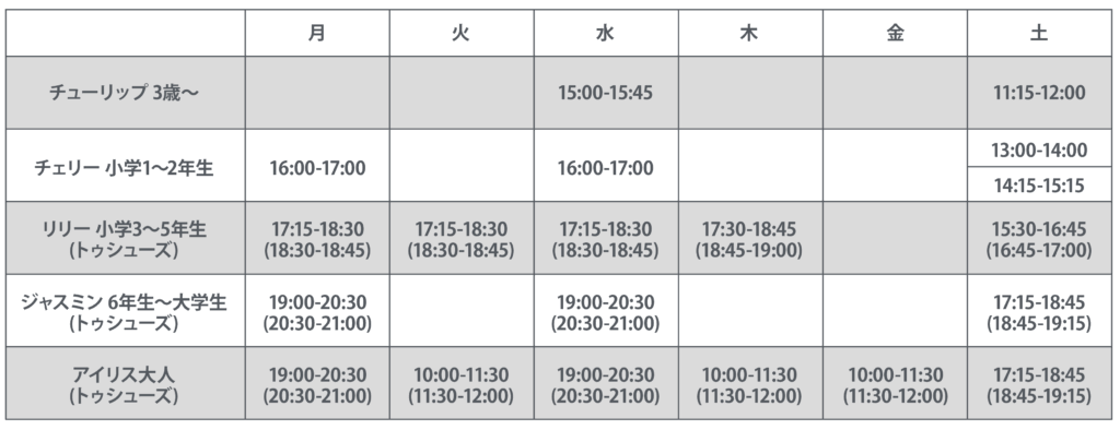 当バレエスタジオでは子供から大人まで楽しみながらバレエの良さを知ってもらいたいと考えています。初心者の方も歓迎していますので、大人になってからバレエを始められる方なども多数いらっしゃいます。